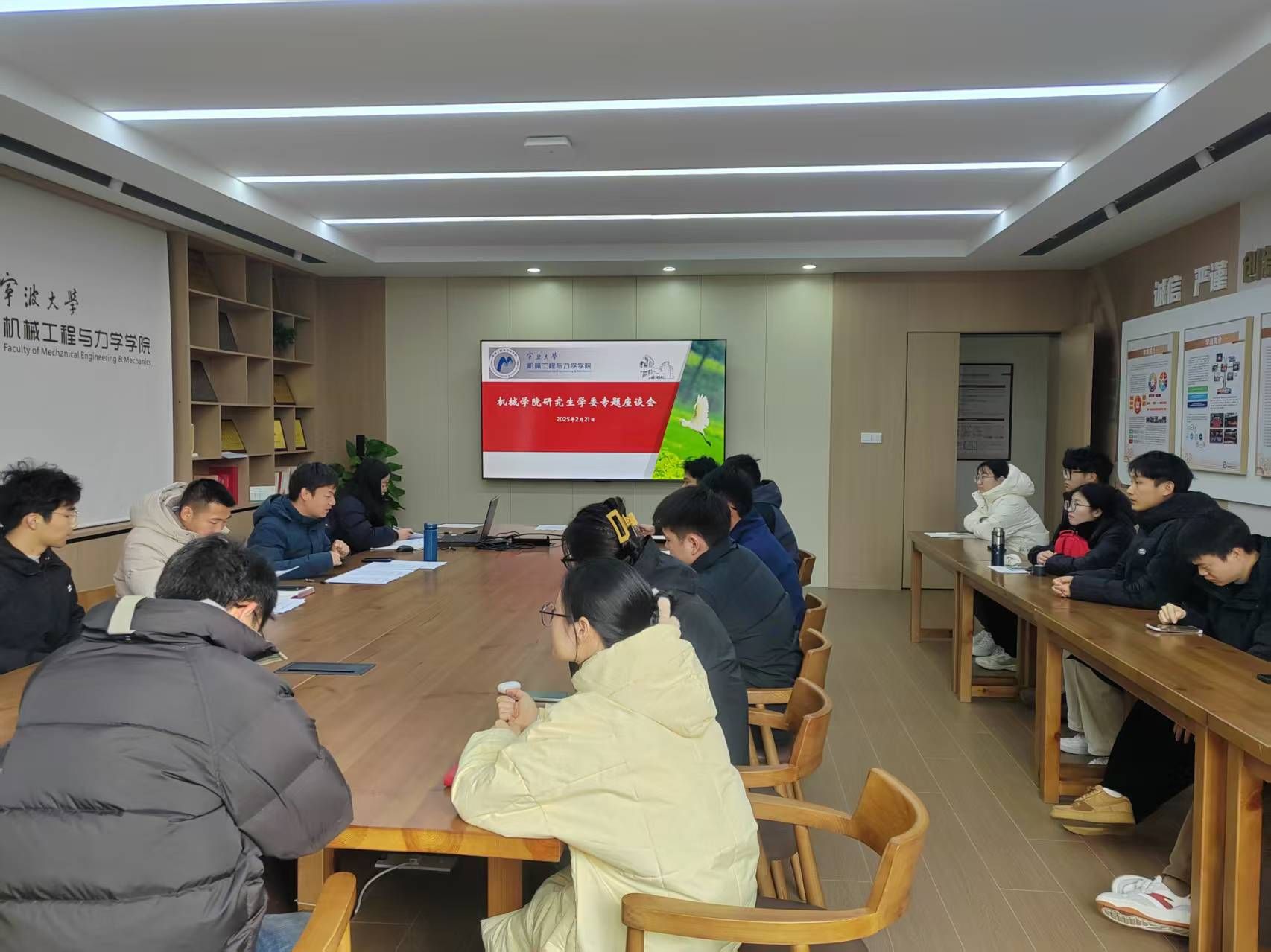 硕士学位论文答辩管理规定(试行)》(机械院政[2025]3号)这三项文件进行了详细解读。通过深入浅出的讲解,帮助同学们更好地理解文件精神,明确学院对研究生培养的最新要求。之后,学工办主任洪松老师结合自身经历,向同学们提出了希望和建议。他鼓励同学们“站好毕业前最后一班岗,就业与毕业两手抓”,在完成学业的同时,积极规划未来,为顺利毕业和就业做好充分准备。