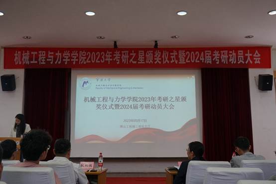 张明华副院长首先介绍了学院2023年考研情况。今年学院考研升学人数、升学率再创新高,共有73人成功考取国内外研究生,其中63人考入“双一流”高校或2023年QS排名前100高校,同时产生了两个全员升学的“金牌寝室”;沈妍伶副书记结合学院近五年考研相关数据,分析了学院各本科专业的考研去向以及学院硕士点的报考情况。随后,力学硕士学位点负责人董新龙教授、机械学科教师李子轩副教授分别宣讲,就学科特色和优势、师资力量和实验条件、科研和人才培养取得的成果介绍学院两大学科,鼓励2020级同学报考我院硕士点。