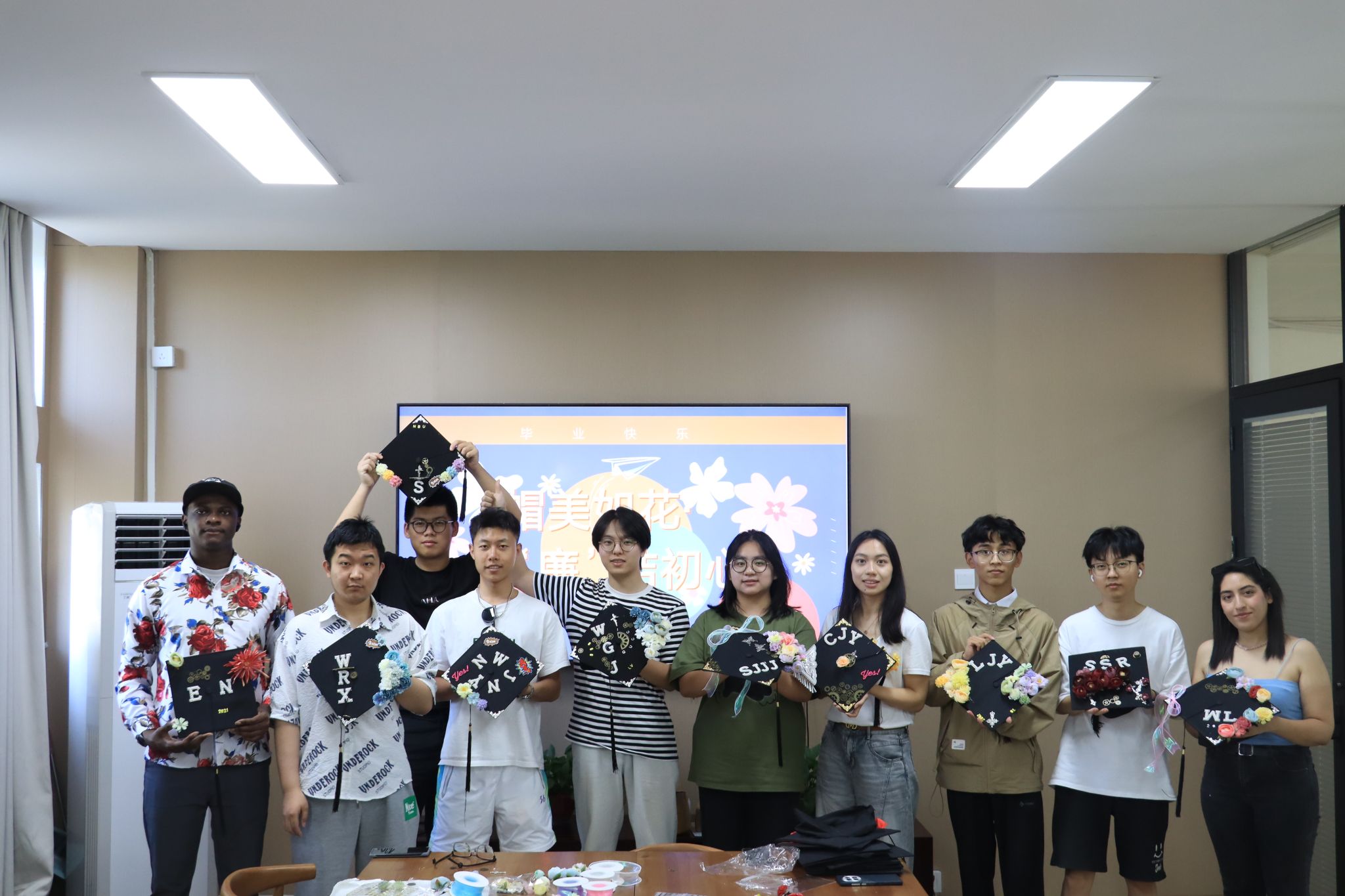 “手指触摸着这些齿轮,实验室里画过的每一张图纸、熬过的夜都涌上心头。真舍不得就这样离开啊!”218智能制造班的陈琪同学感慨道。旁边精心簪花的女生轻声补充:“亲手制作学士帽,像是把四年时光都编织进去了,比任何买来的纪念品都有温度。”留学生们LAFAI WISSAL也兴奋表示:“I am very happy to participate in this event and thank the college for preparing this gift for us. It is very beautiful.”